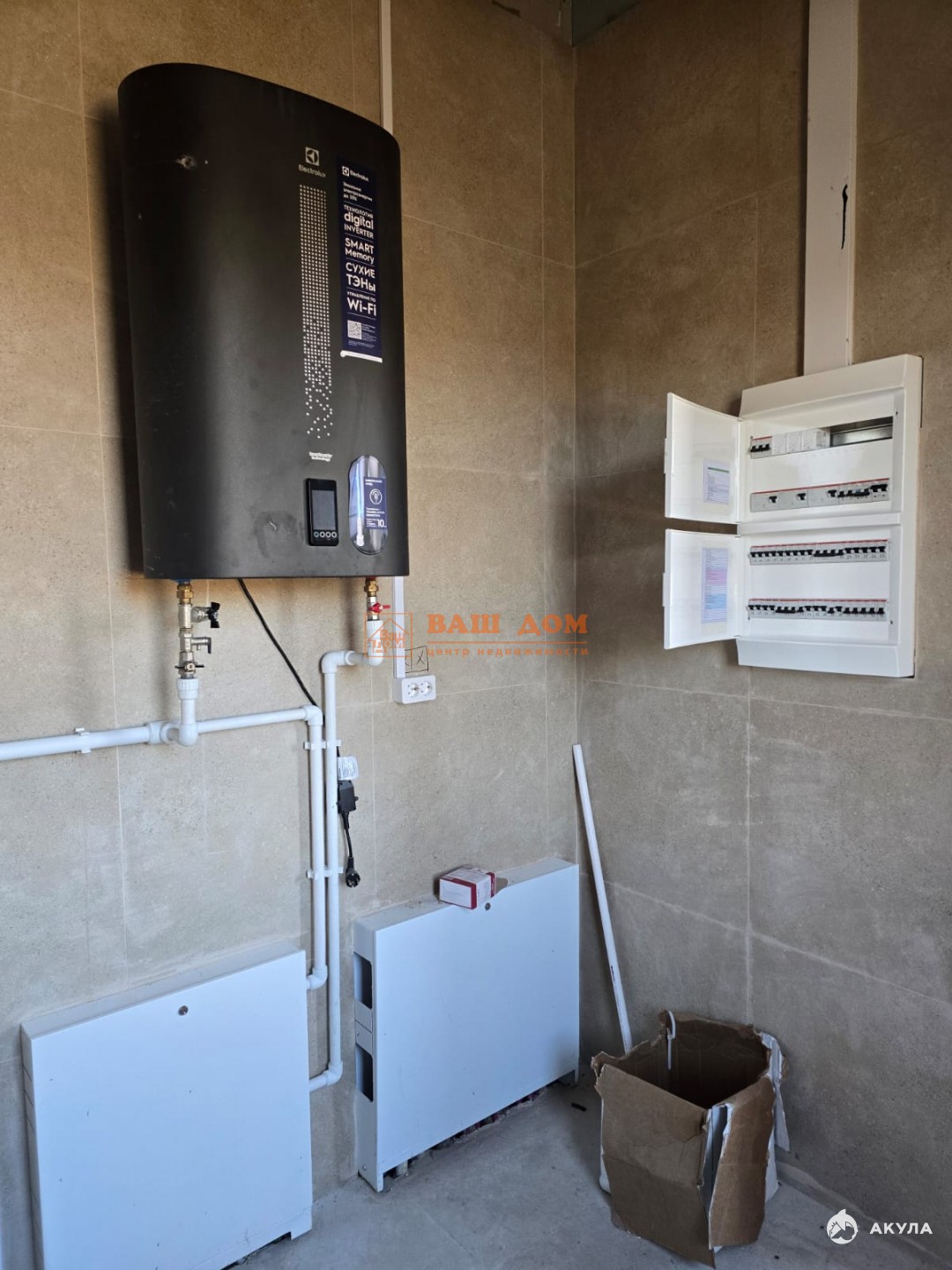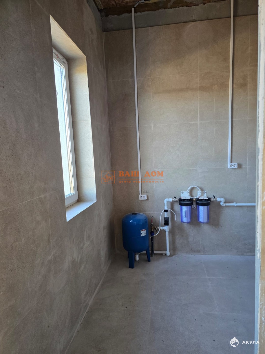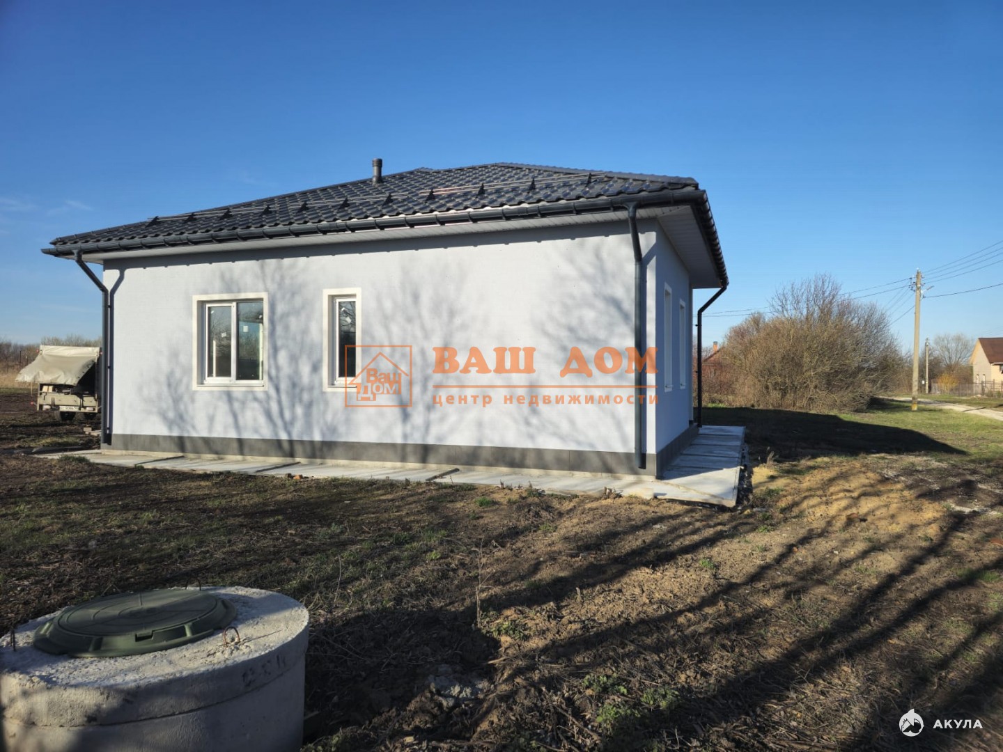 Дом общей площадью 70 кв м, материал блок 300 мм плюс 100 мм утеплитель, фасад декоративная штукатурка, фундамент плита бетонная 300 мм плюс утепление 100 мм, отмостка, цоколь отделан плиткой. В доме установлены стеклопакеты, заведены все коммуникации (электричество 15 кВ, вода, септик). Установлен электрический котёл, бойлер, система очистки воды. Газ по границе участка. Кровля - металлочерепица. Дом под чистовую отделку: залит и разведен тёплый пол, выровнены стены, разведена электрика, бойлерная отделана плиткой, теплая входная дверь с терморазрывом. В доме прихожая, бойлерная, гардеробная, две спальни и кухня-гостинная с выходом во двор. В строительстве использовались материалы не эконом класса. Участок ровный, отмежеван.